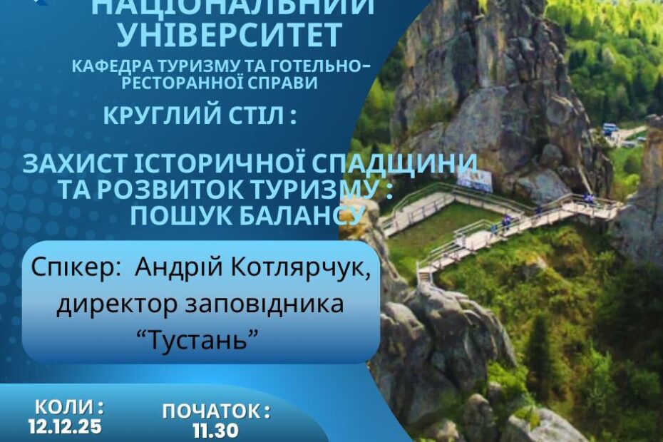 12 грудня 2025 року у межах започаткованого на кафедрі туризму та готельно-ресторанної справи Хмельницького національного університету циклу наукових досліджень «Розвиток туризму в територіальних громадах» (комунікаційний… Читати далі »Круглий стіл на тему «Захист історичної спадщини та розвиток туризму: пошук балансу»