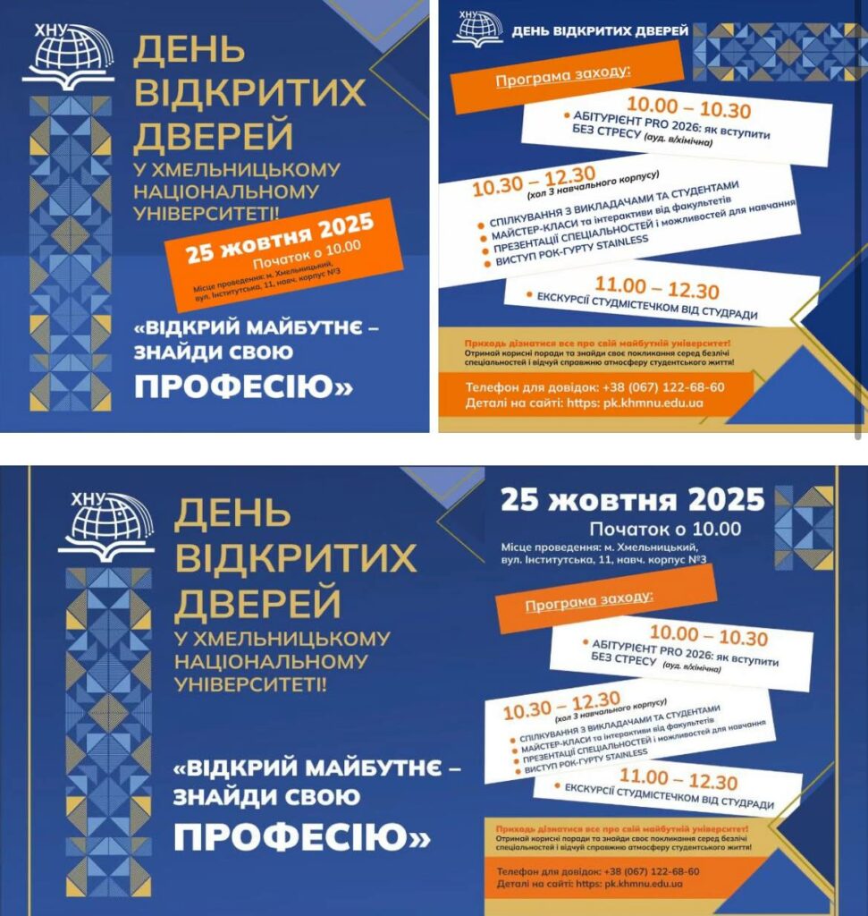 25 жовтня 2025 року у Хмельницькому національному університеті відбувся День відкритих дверей, що об’єднав майбутніх абітурієнтів, викладачів і студентів. Майстер-класи, презентації спеціальностей, поради від приймальної комісії, екскурсії й драйвовий виступ гурту Stainless зробили цей день незабутнім! Дякуємо всім, хто був з нами — твоя історія успіху починається у ХНУ!