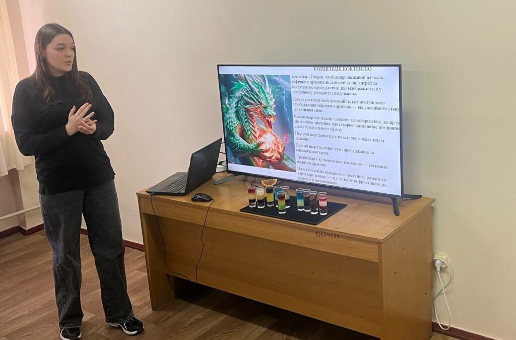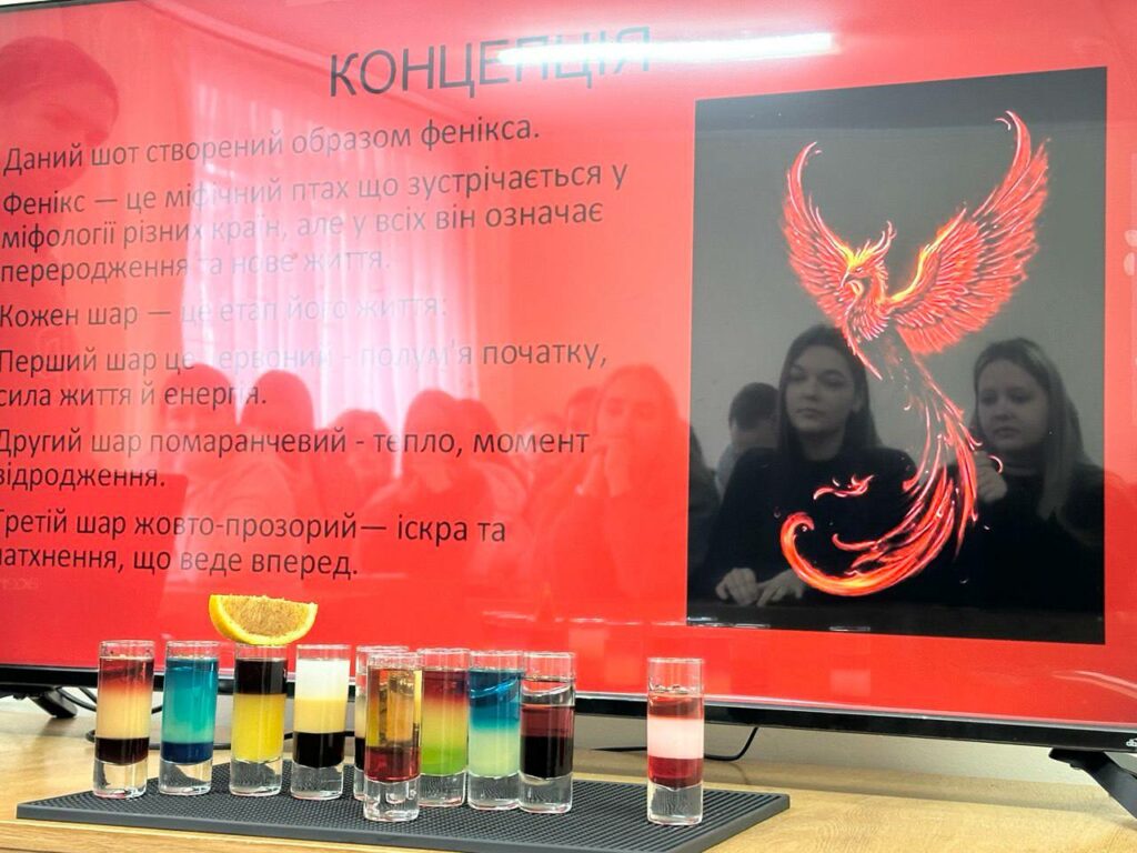 15–16 грудня 2025 року в межах дисципліни «Барна справа та організація роботи сомельє» (викладач — Наталія АНТОШКОВА) для здобувачів освіти ОПП «Готельно-ресторанна справа» відбувся захист індивідуальних завдань на тему: «Приготування та подавання шотів. Органолептична оцінка якості». Під час заходу здобувачі освіти презентували авторські проєкти коктейлів-шотів, які охоплювали повний цикл створення напою: від формування ідеї та концепції, розробки рецептури й підбору інгредієнтів — до визначення органолептичних показників якості (смак, аромат, колір, консистенція) та професійної демонстрації приготування і подавання коктейлю. Здобувачі вразили креативним підходом, сміливими експериментами з інгредієнтами, нестандартними поєднаннями смаків і ароматів, а також естетикою оформлення напоїв. Кожен проєкт вирізнявся індивідуальністю та прагненням до інновацій. Захист пройшов у атмосфері творчого драйву, яскравих ідей та професійного натхнення, ставши не лише перевіркою знань і навичок, а й справжнім святом сучасної барної культури.