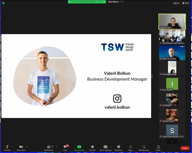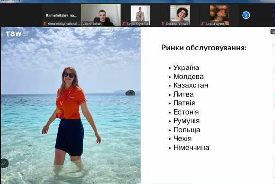 06 березня 2026 року для здобувачів освіти кафедри туризму і готельно-ресторанної справи відбулася презентація можливостей міжнародного стажування, організована компанією Travel Study Work. Представники компанії — директорка Руслана ЖОВТАНІ та менеджер Валерій БОЛКУН — ознайомили здобувачів з програмами стажування, що відкривають можливості для отримання практичного досвіду у найпопулярніших туристичних напрямках, зокрема в Туреччині, Болгарії, на Кіпрі, в Італії та інших країнах. Такі програми дозволяють здобувачам здобути цінний професійний досвід у сфері туризму та гостинності: працювати у провідних готельних мережах світу, представляти туристичних операторів, а також поєднувати практичну діяльність із навчанням. Під час зустрічі спікери детально розповіли про умови участі у програмах стажування, розмір стипендії, особливості оформлення необхідних документів, перспективи професійного та кар’єрного зростання. Кафедра туризму та готельно-ресторанної справи висловлює щиру подяку партнерам — компанії Travel Study Work, а також особисто Руслані ЖОВТАНІ та Валерію БОЛКУНУ — за змістовну презентацію, надані можливості для міжнародного стажування і працевлаштування наших здобувачів, а також за підтримку та розвиток партнерської співпраці з університетом.